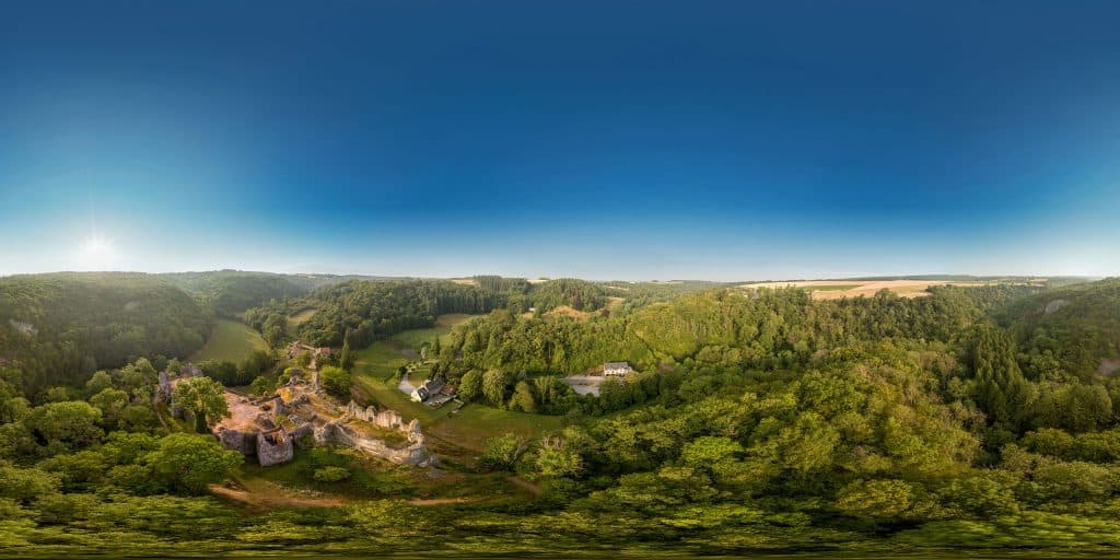 The ruins of the medieval fortress of Montaigle are located in the Belgian village of Falaën in the Walloon Region in the province of Namur. Situated at the confluent of the Molignée and the Flavion, the castle rises on a rocky spur of the escarpment which was occupied by a small military garrison at the end of the Roman period, Byzantine Era (± IIIrd to Vth century) and probably served as a place of refuge for the local populations during the germanic invasions. The castle, whose construction dates back to the early fourteenth century, was destroyed by Henry II of France in 1554